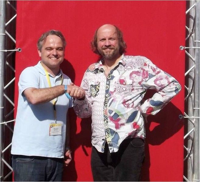 Auf dem Foto sieht man John Ruhrmann (A&R Manager, MELODIE DER WELT) und Burghardt Wegner (Grünschnabel) beim Vertragsabschluss auf dem Reeperbahn Festival 2014 in Hamburg.